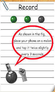 Because of different water content of a mature watermelon and an immature one, there are differences in tones when tap with your finger. The software collects and analyzes the sound to distinguish whether a watermelon is meture or not. After the software analyzed the noise of the background, place your phone on a watermelon. Then tap the watermelon twice slightly every 3 second. Wait for a moment you can get the result. And you can see the waves of data at the report screen.