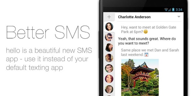 You can group chat easily, send and receive photos quickly, and switch between chats with a single touch. Hello is a streamlined way to text: no inbox, no clutter, no ads. Just you and your conversations.